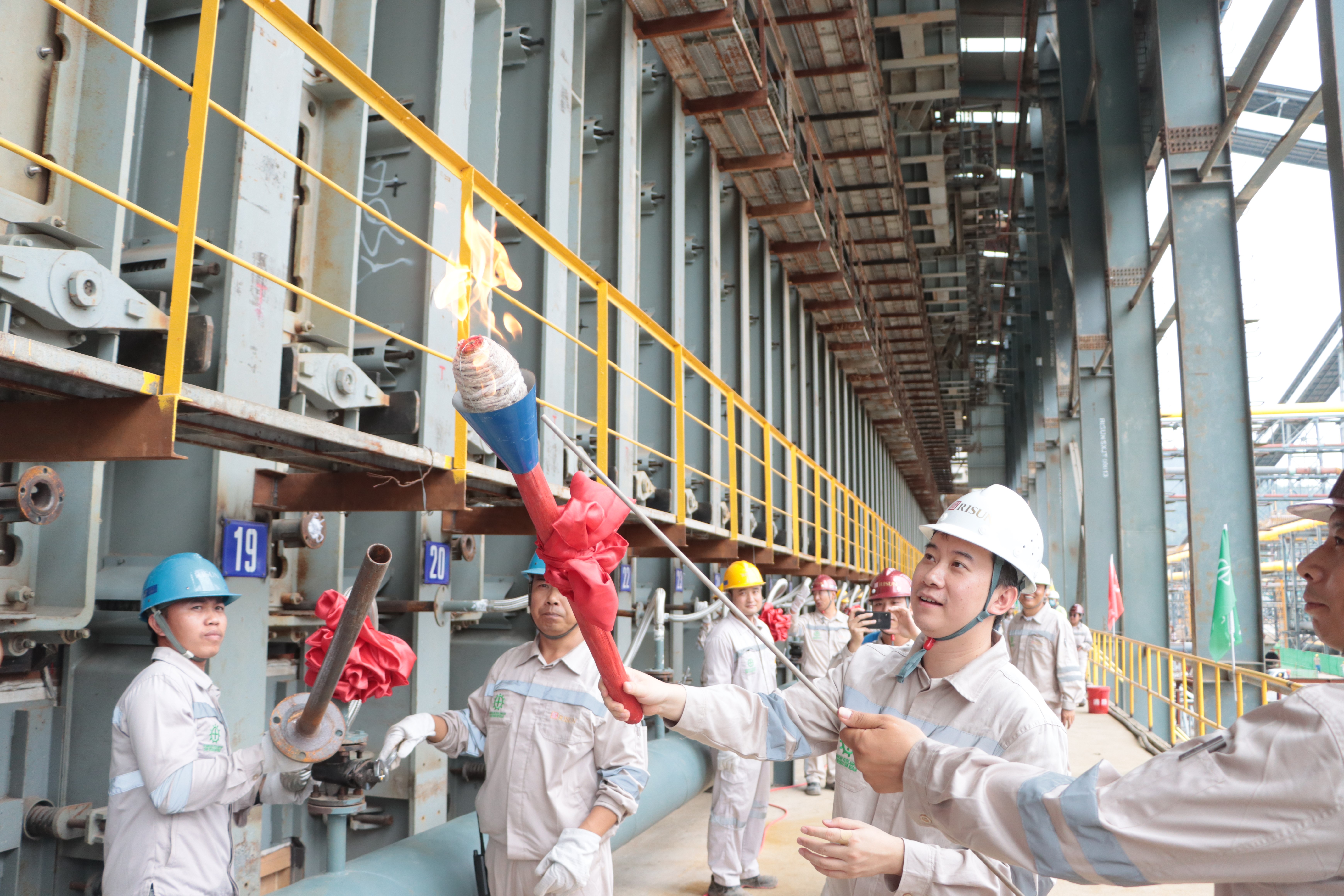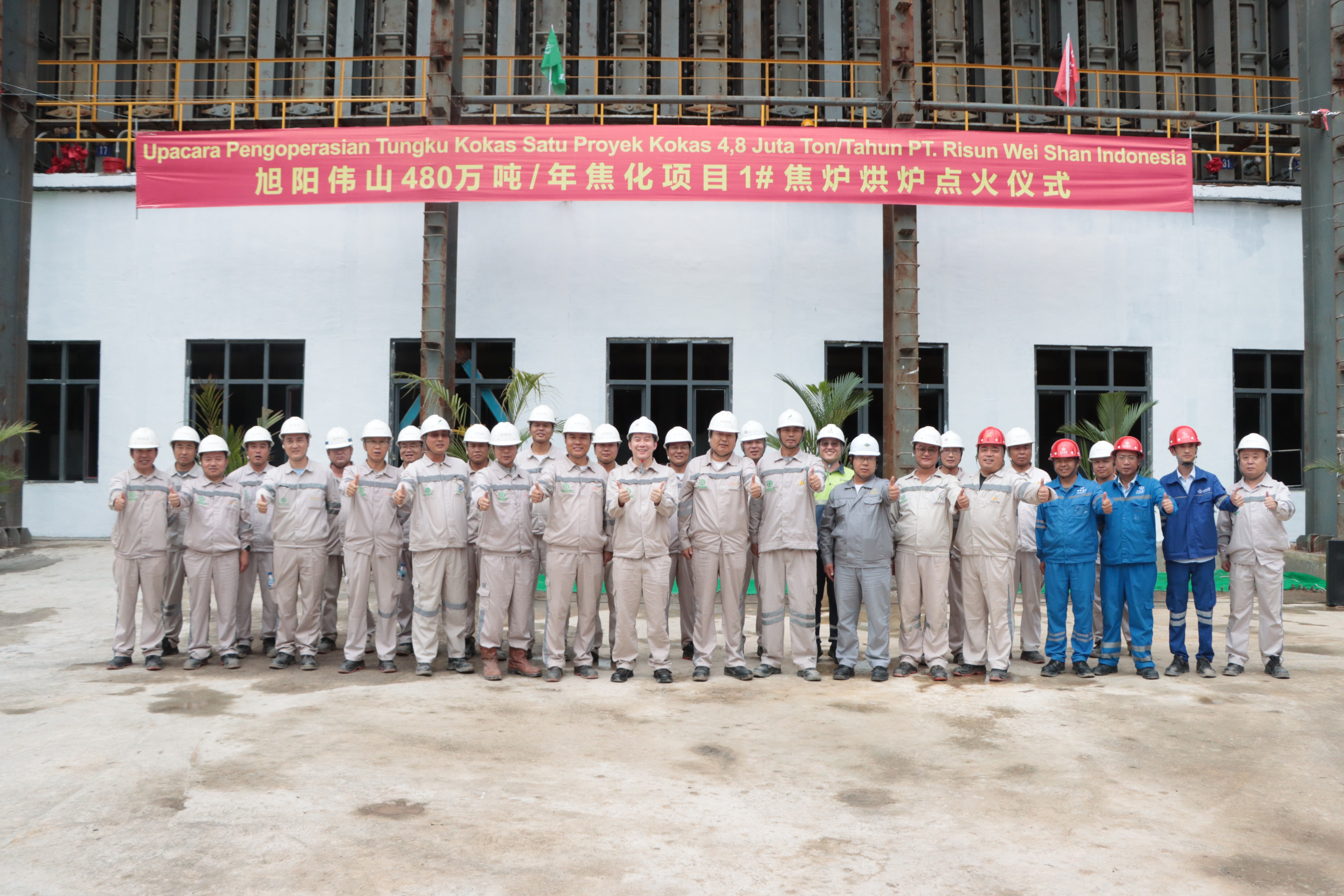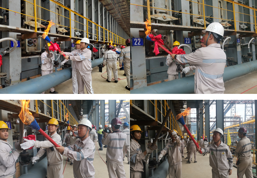 随着杨路手持火炬点燃机侧18#燃烧器,出席仪式的领导和员工代表按照规程依次点火,在仪式现场及后方人员线上共同见证下,旭阳集团印尼苏拉威西园区年产480万吨焦化项目第二座焦炉烘炉点火圆满完成。